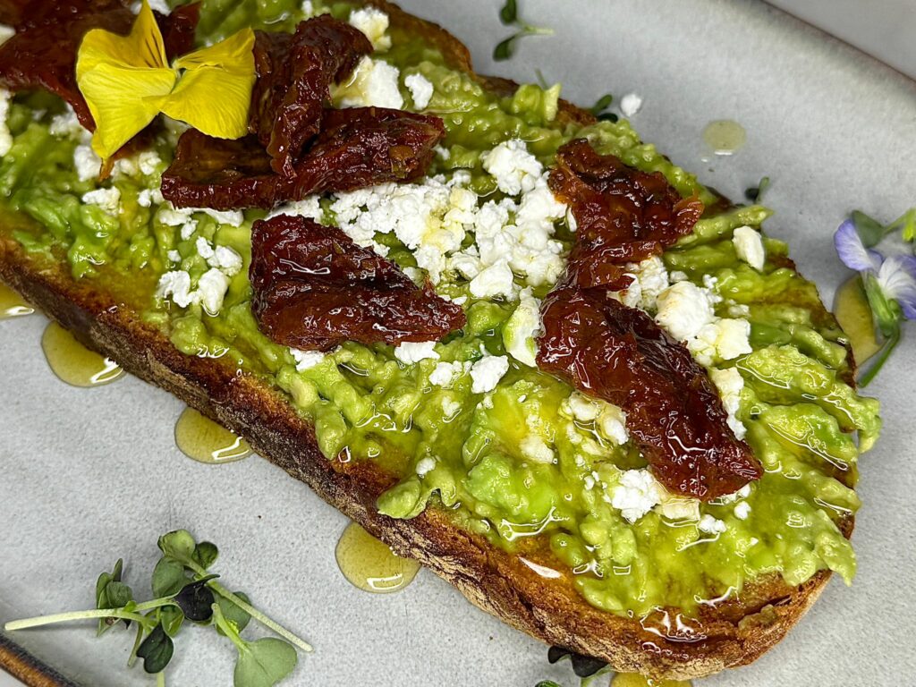 Smash de aguacate, queso feta, granada, brotes y topping deshidratao