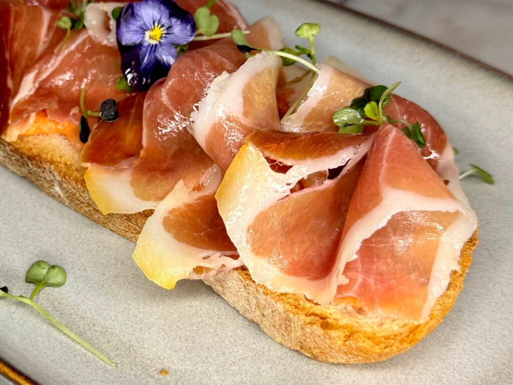 Mermelada de tomate, tomate seco, jamón serrano y brotes
