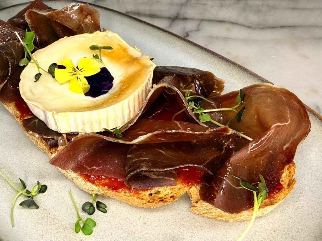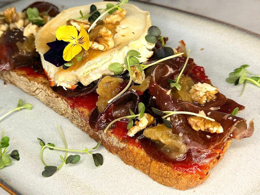 Pimiento caramelizado, cecina de León, cebolla caramelizada, rulo de cabra y nueces